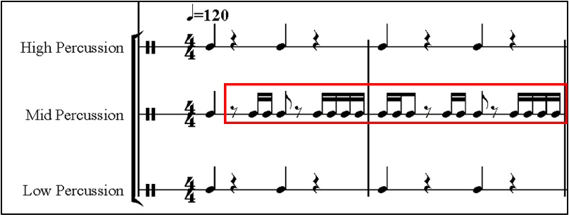 As seen above, the simplification process focussed more on diminishing rhythmic complexity rather that melodic complexity. This focus largely comes from choosing a piece with a simple melodic contour rather than a difficult one. Whilst simplifying the parts wasn’t necessarily a difficult task, two things needed to be considered during the process. Firstly, although rhythms were being simplified, the simplified arrangement needed to still remain recognisable to the ear after completion. Secondly, the instrumental roles in the simplified arrangement need to be close to identical to those in the original arrangement, i.e. the parts can’t be simplified too much as it would result in the arrangement sounding muddy and parts would be blurred.