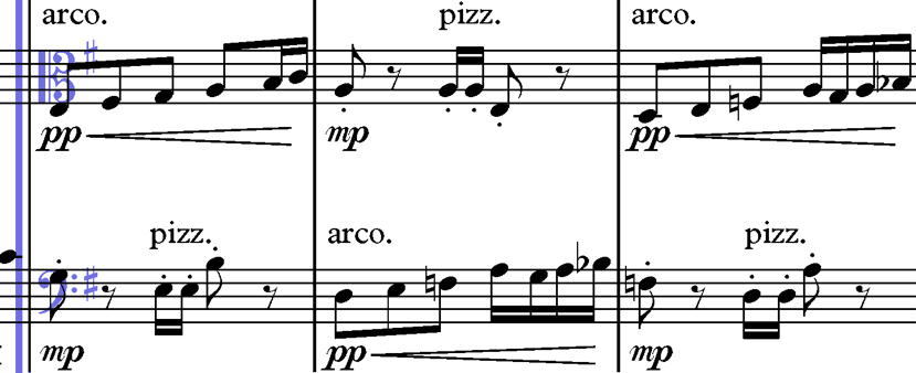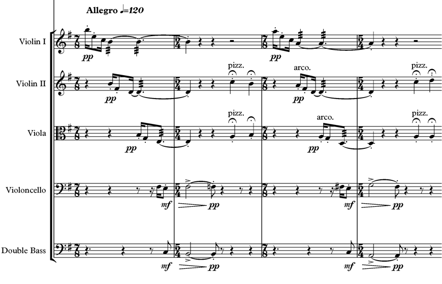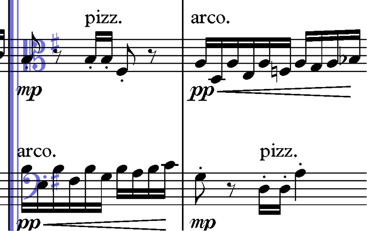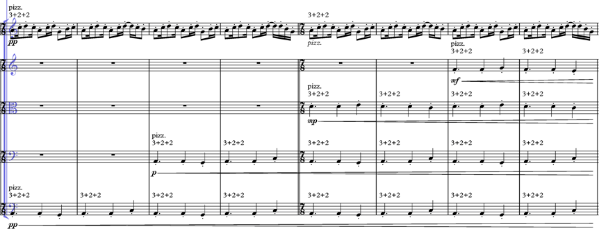 In the below excerpt, I use a variation in texture and instrumental techniques as well as variations in dynamics to extend my ideas. I begin the excerpt with the melody played in the 1st Violin using pizzicato with the Double Bass playing a basic accompaniment. Every two bars, the accompaniment is transferred into another part and the dynamics increase over 8 bars until the entire ensemble is playing.