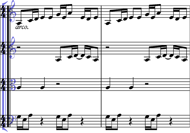 I decided to have the violin 1 playing the full ostinato repeated with the intention of shifting the melody to some of the other voices later in the piece. Keeping with fragments of the main theme and not modulating meant that any pitch clashes were averted. In the violin 2 I decided to use the first beat of the phrase combined with a retrograde of the same beat with a tie connecting the two D’s to create a small syncopated figure.
