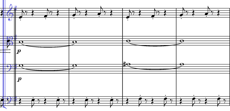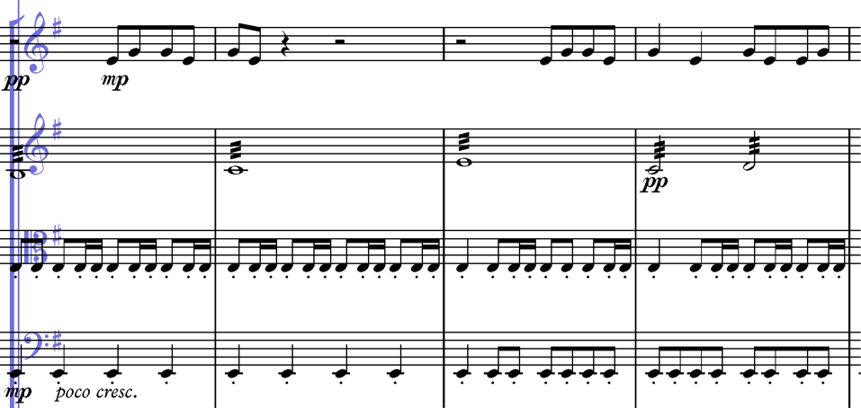 In this example, I have augmented the first fragment of the original motif in the 1st Violin and increased the prevalence of the rhythmic expansion in the Viola. In addition to this I guess you could say I transferred an extended augmentation of the idea in the Viola into the Cello but that wasn’t necessarily the intention, I just wanted to create a part that I could build upon and use to gain momentum as the section developed.