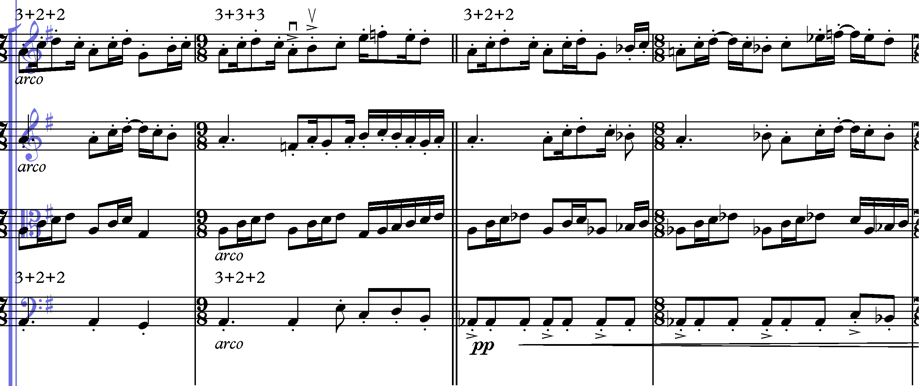 Here comes the fun stuff. I am a composer who loves to shift entries in a similar way to Philip Glass. What I have done in this section is shift the 7/8 motif in the 2nd Violin and introduced it 2 bars after the 1st Violin however I’ve done so with a twist. I have introduced the idea down a third with the idea starting in hypothetically the second bar of the phrase however being introduced in the third bar of the sequence.